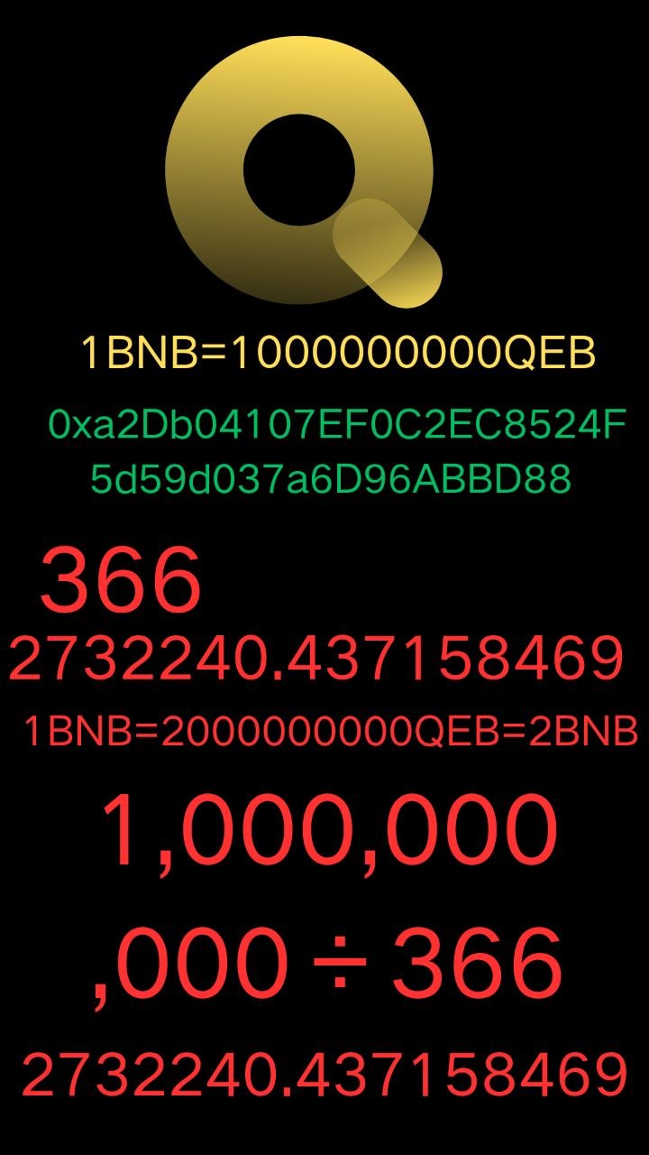 Once you switch to the 366 protocol address, you will receive 1 billion QEB and 1 BNB in equivalent value. After receiving these 1 billion QEB, which is equivalent to 1 BNB in value, you will receive a daily dividend of 2,732,240.437158469 QEB. This dividend will continue for 366 days until it ends. Of course, to strengthen the early high consensus, if you only sell the daily dividend, we will continue to pay dividends normally. If you sell all of it, then the dividend will stop. If you continue to hold and invest, we will continue to distribute for 3 years until it ends. Of course, this is a long period of time. Let's describe it in a few words: "Never be impatient, and accumulation means more." This group of people will be the richest in this era. I hope those who have the right connection will meet, be grateful, and cherish.